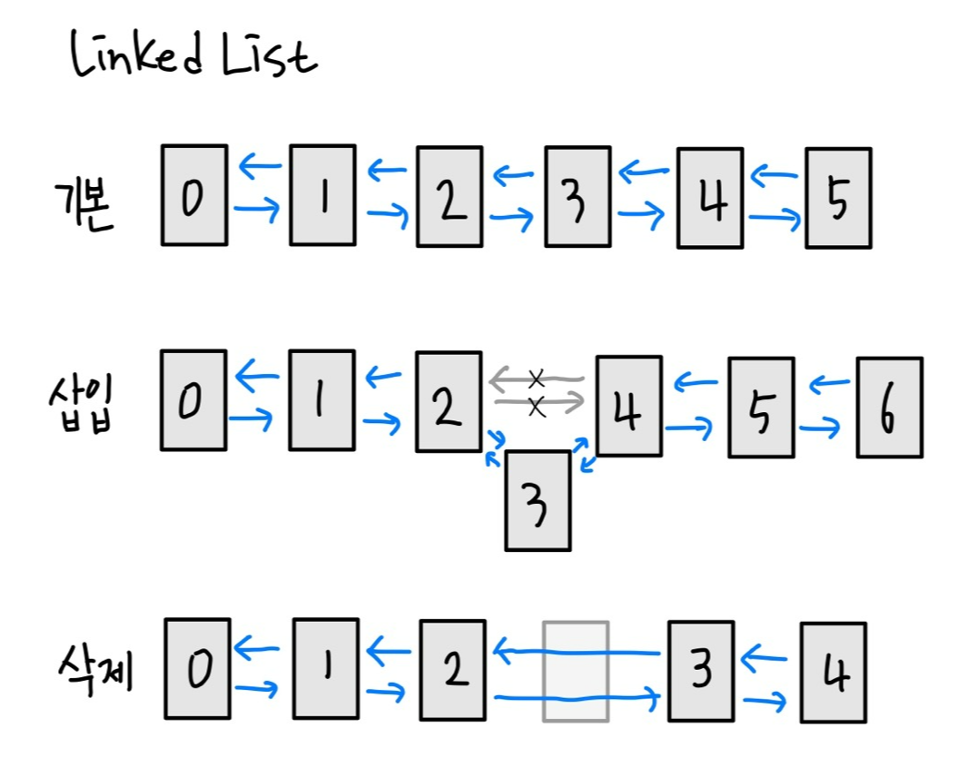 객체를 삽입이나 삭제 할 때, 앞 뒤 링크만 변경되고 나머지 링크는 변경되지 않는다. (아래 그림 참조)