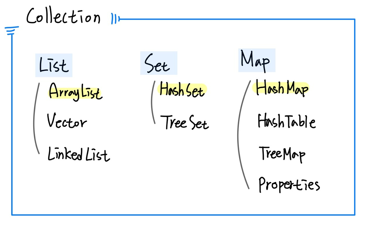컬렉션 프레임워크의 주요 인터페이스로는 List, Set, Map이 있다.