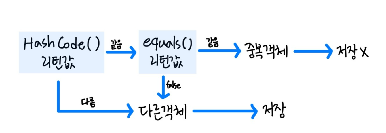 동일하다면 다시 equals() 메소드로 비교한 뒤 true가 나오면 동일한 객체로 판단하고 저장하지 않는다.