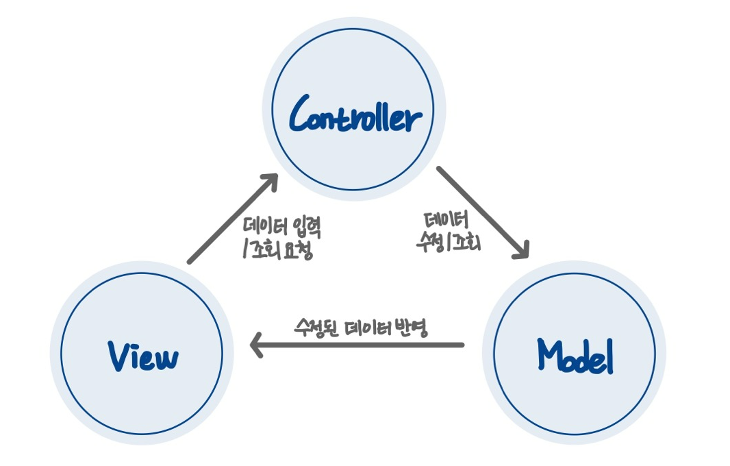 - 사용자가 뷰에서 데이터 입력/조회를 요청하면 모델로 가는 것이 아니라 컨트롤러를 거치게 되는데,