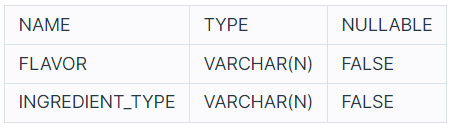 ICECREAM_INFO 테이블 구조는 다음과 같으며, FLAVOR, INGREDITENT_TYPE 은 각각 아이스크림 맛, 아이스크림의 성분 타입을 나타냅니다. INGREDIENT_TYPE에는 아이스크림의 주 성분이 설탕이면 sugar_based라고 입력되고, 아이스크림의 주 성분이 과일이면 fruit_based라고 입력됩니다. ICECREAM_INFO의 기본 키는 FLAVOR입니다. ICECREAM_INFO테이블의 FLAVOR는 FIRST_HALF 테이블의 FLAVOR의 외래 키입니다.