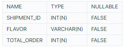 ICECREAM_INFO 테이블 구조는 다음과 같으며, FLAVOR, INGREDITENT_TYPE 은 각각 아이스크림 맛, 아이스크림의 성분 타입을 나타냅니다. INGREDIENT_TYPE에는 아이스크림의 주 성분이 설탕이면 sugar_based라고 입력되고, 아이스크림의 주 성분이 과일이면 fruit_based라고 입력됩니다. ICECREAM_INFO의 기본 키는 FLAVOR입니다. ICECREAM_INFO테이블의 FLAVOR는 FIRST_HALF 테이블의 FLAVOR의 외래 키입니다.
