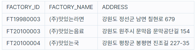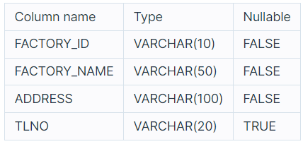 다음은 식품공장의 정보를 담은 FOOD_FACTORY 테이블입니다. FOOD_FACTORY 테이블은 다음과 같으며 FACTORY_ID, FACTORY_NAME, ADDRESS, TLNO는 각각 공장 ID, 공장 이름, 주소, 전화번호를 의미합니다.