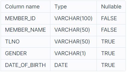 다음은 식당 리뷰 사이트의 회원 정보를 담은 MEMBER_PROFILE 테이블입니다. MEMBER_PROFILE 테이블은 다음과 같으며 MEMBER_ID, MEMBER_NAME, TLNO, GENDER, DATE_OF_BIRTH는 회원 ID, 회원 이름, 회원 연락처, 성별, 생년월일을 의미합니다.